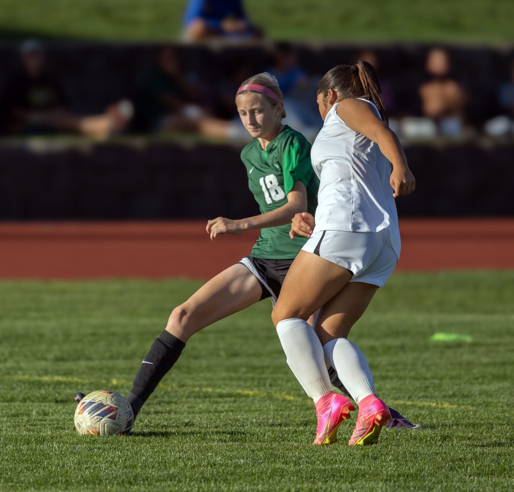 Pendleton’s MacKenna Naughton (18) attempts to pass around a Riverside defender on Sept. 25, 2025, in Pendleton.