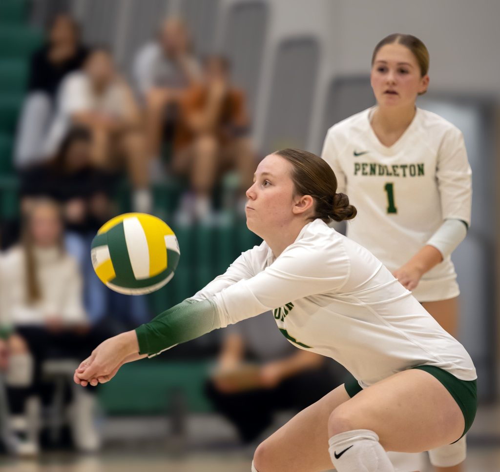 Pendleton’s ??????? receives a serve while playing Ontario on Oct. 16, 2025, at Warberg Court.