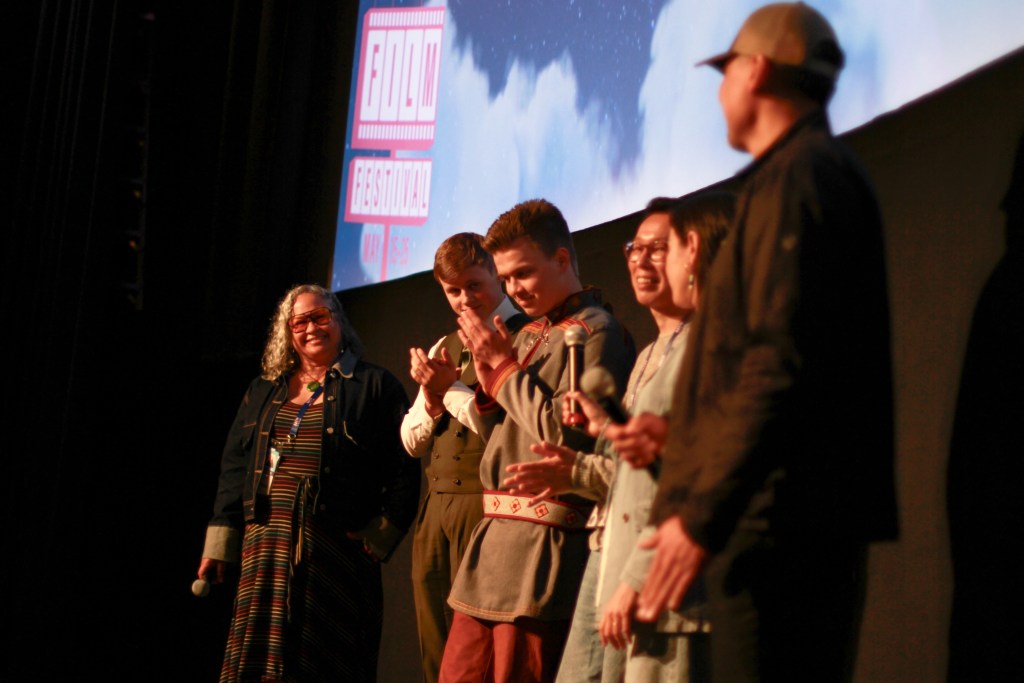 Tracy Report (left), founder and co-director of 4th World Media Lab, introduced Indigenous filmmakers after screenings of their films during the 51st Seattle International Film Festival (SIFF). 2025 marks the 10th anniversary of 4th World Media Lab as part of the Seattle International Film Festival which takes place in person May 15th to 25th and online May 26th to June 1st.(Photo by Jarrette Werk, Underscore Native News / Report for America)