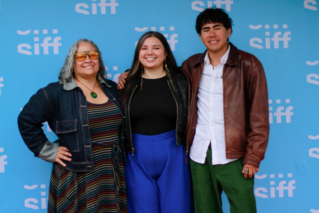 Tracy Rector, founder and co-director of 4th World Media Lab, poses with director Paige Bethmann and film subject Kutoven “Ku” Stevens during the 51st Seattle International Film Festival. Bethmann, a 2023 4th World Media Lab fellow, directed Remaining Native, a coming-of-age documentary centered on Stevens, a 17-year-old Native runner navigating his athletic dreams while confronting the legacy of his great-grandfather’s escape from an Indian boarding school. (Photo by Jarrette Werk, Underscore Native News / Report for America)