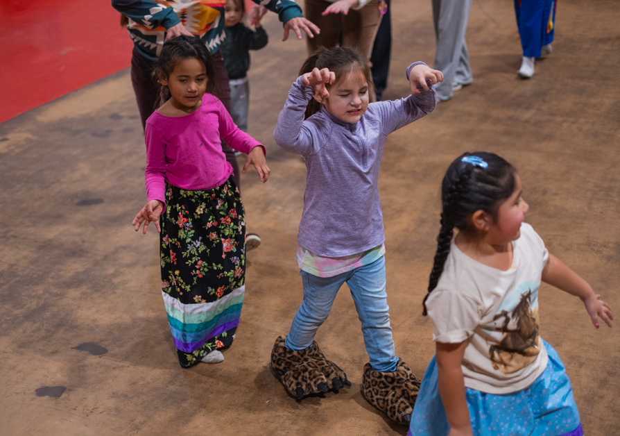 As children practiced their steps, they also had access to a small but growing closet of regalia — shawls, wing dresses, shell dresses, bear-claw feet, ribbon shirts and more — giving them a chance to see how movement and regalia work together.