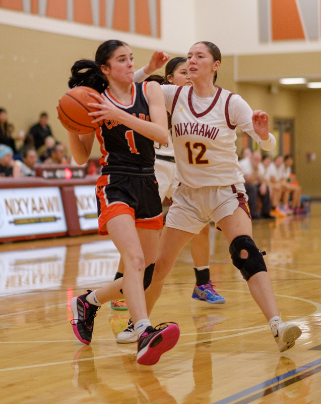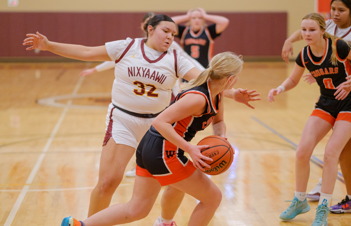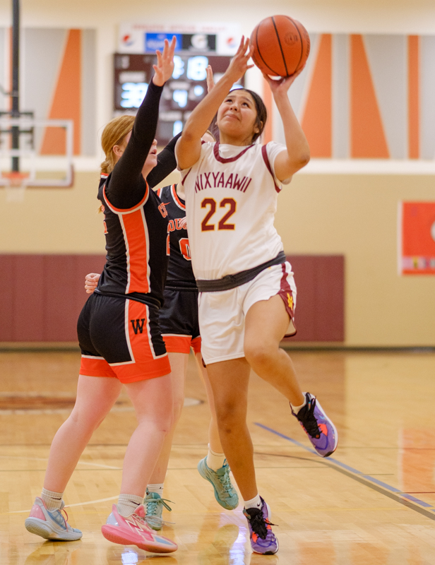 Nixyaawii’s Liana Stewart (22) drives to the basket for a layup Jan. 8, 2026, at Nixyaawii Community School. (Yasser Marte/The CUJ)Nixyaawii’s Neveah Moore (32) defends against Wallowa’s Preslie Hagen (10) on Jan. 8, 2026, at Nixyaawii Community School. (Yasser Marte/The CUJ)Wallowa’s Lily Witherup (1) drives in for a layup against Nixyaawii’s Annalise Watchman (12) Jan. 8, 2026, at Nixyaawii Community School. (Yasser Marte/The CUJ)Wallowa’s Preslie Hagen (10) rises for the jump shot against Nixyaawii’s Neveah Moore (32) Jan. 8, 2026, at Nixyaawii Community School. (Yasser Marte/The CUJ)