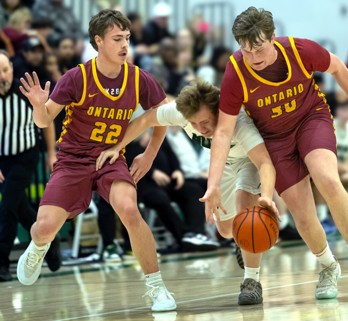 Pendleton’s Zane Emry (3) and Ontario’s Aidan Evers (30) scramble for a loose ball on Feb. 13, 2026, at Warberg Court. (Kathy Aney/The CUJ)