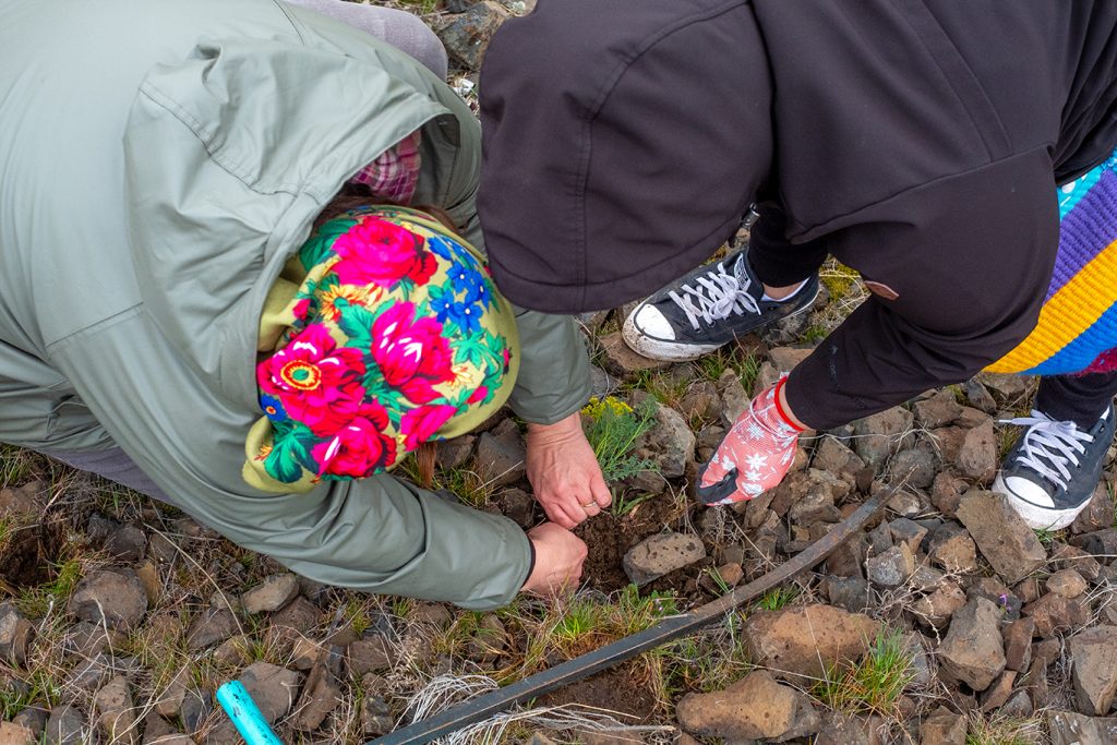 “And when we’re digging, we’re gonna push down and then we’re gonna wiggle, wiggle,” she said, gently working the kupin into the dirt. “We’re gonna wiggle that kupin in there to get down into the soil beneath the roots, then pull back, pull back and pull up that root.”