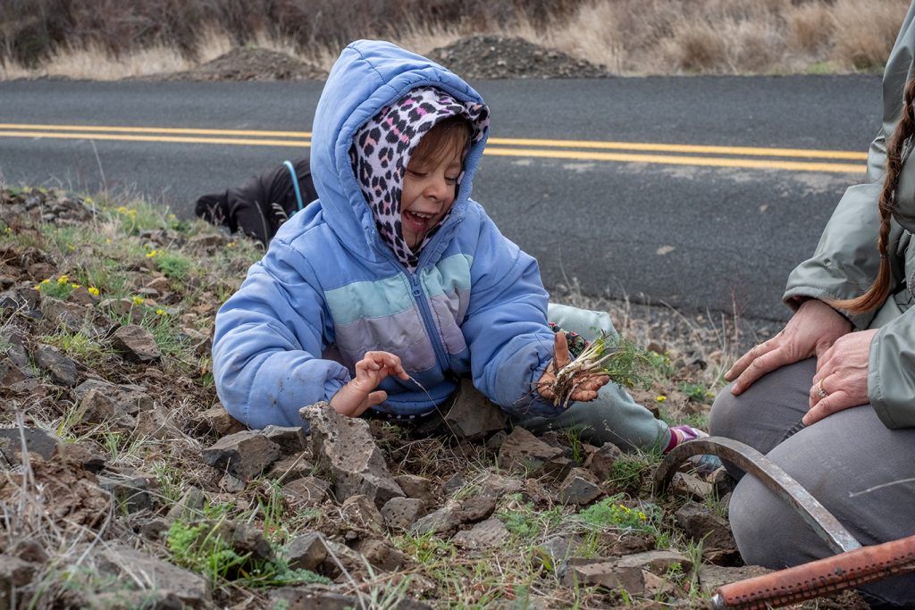 The harvest, led by the CTUIR Family Engagement Program and Department of Natural Resources’ Cultural Resource Protection Program, guided participants through the hills between Pilot Rock and Heppner to harvest the First Food and continue a tradition passed down through generations.