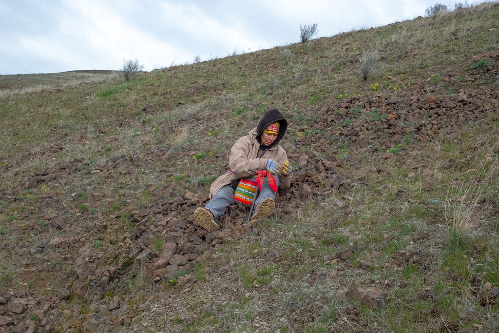 At the top of the hill, CTUIR member DeArcie Abraham, who gathered with her 7-year-old son Messiah Abraham, said she looked for watersheds with rocky soil.