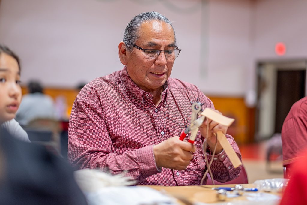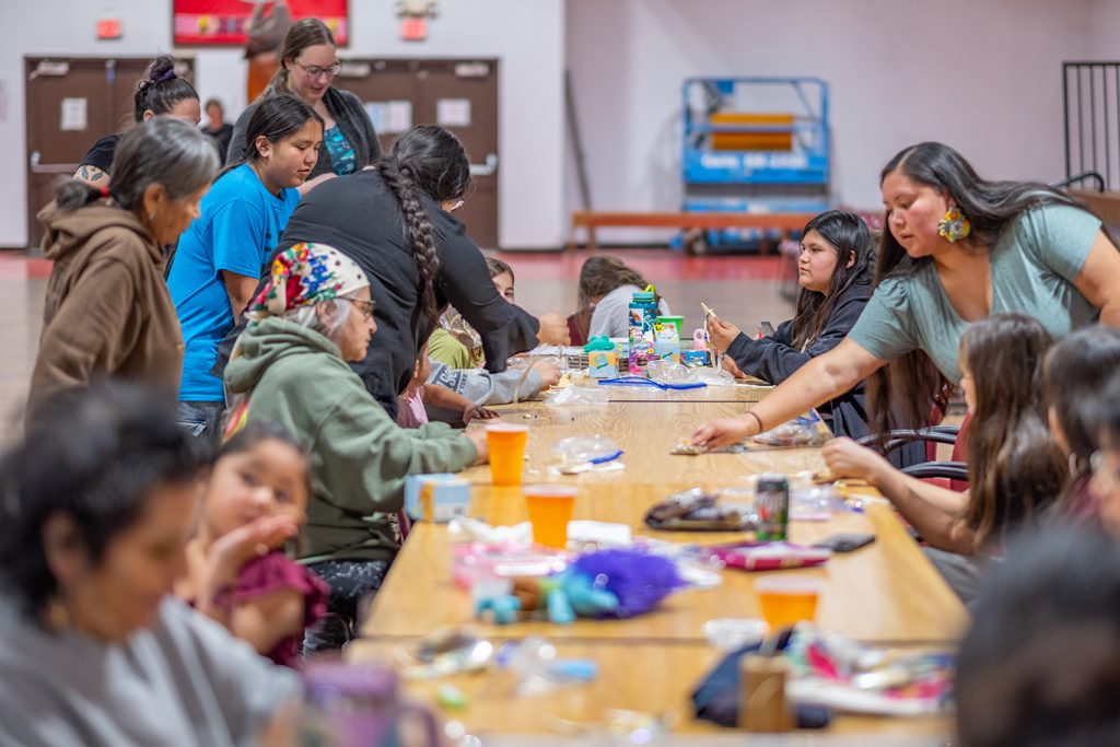 About 30 family members and friends joined the evening’s activities, with elders and youth sitting side by side, speaking the Umatilla language and crafting pieces for their regalia. The event blended learning and connection, as participants passed down cultural knowledge through both conversation and craft.