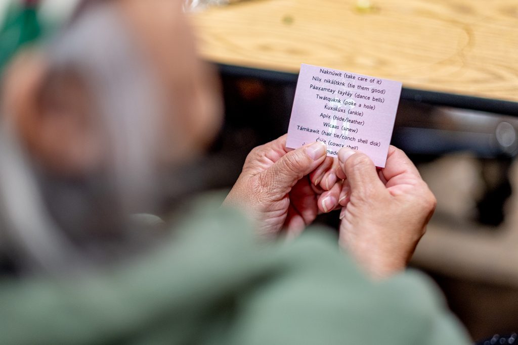 CTUIR member Mildred Quaempts stood before the youth and taught them Umatilla phrases such as twátquknk (“poke a hole”), apɨx (“leather” or “hide”), támakawit (“hair tie” or “conch shell disk”) and naknúwít (“take care of it”), among others. The children followed along with cards that helped them learn the words alongside Quaempts.