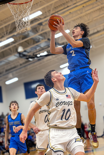 Pilot Rock’s Sun Schimmel goes to the hoop over Echo defenders on Jan. 9, 2026, in Echo. (Kathy Aney/The CUJ)